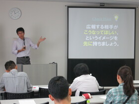 今年のテーマは「広報」。一瞬で目を惹くようなキャッチフレーズやイベントに参加してみたくなるようなチラシの説明文って、どうやって生まれるのだろう。講師の米山さんから、広報に必要なエッセンスをレクチャーしていただきました。