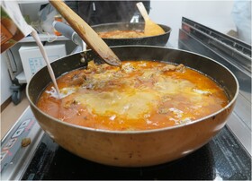 フライパンに油を熱して、マスタードシードを加えて油の温度を確かめます。パチパチという音がするようになったら順番にスパイスを加えてゆくのですが、スパイスが加わるごとにそれはそれは良い香が立ち込めてきて、ここは南インドの町角ですか?という雰囲気に♪