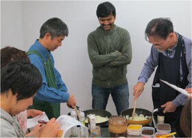 玉ねぎを加えて飴いろになるまでじっくりと炒めている間に、バブさんにインドの気候や食文化など色々なお話を伺います。インド人は毎日カレーを食べますが、スパイスや食材が変わるため「それぞれ全然違う料理」だそうです。ちなみにバブさんのお子さんは生後7カ月から離乳食でカレーを食べているそうです。インドでは最高気温が50度まで上がるのですが、辛いカレーを食べて汗を出すことで身体を冷やす効果もあるようです。