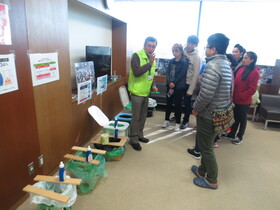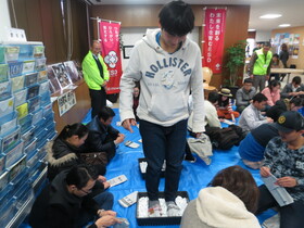 種類がたくさんある簡易トイレに座り、座りごごちの違いを確かめたり、備蓄品や非常持ち出し袋の中身についての説明を受けたりしていました。そして、過去の震災写真も見て回りました。参加者はどのブースでも真剣に話を聞き、たくさん質問が出ていました。