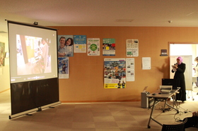 まず、日本語教室紹介DVDの上映では、学習者のエヴィさんがナレーション役を務めました。