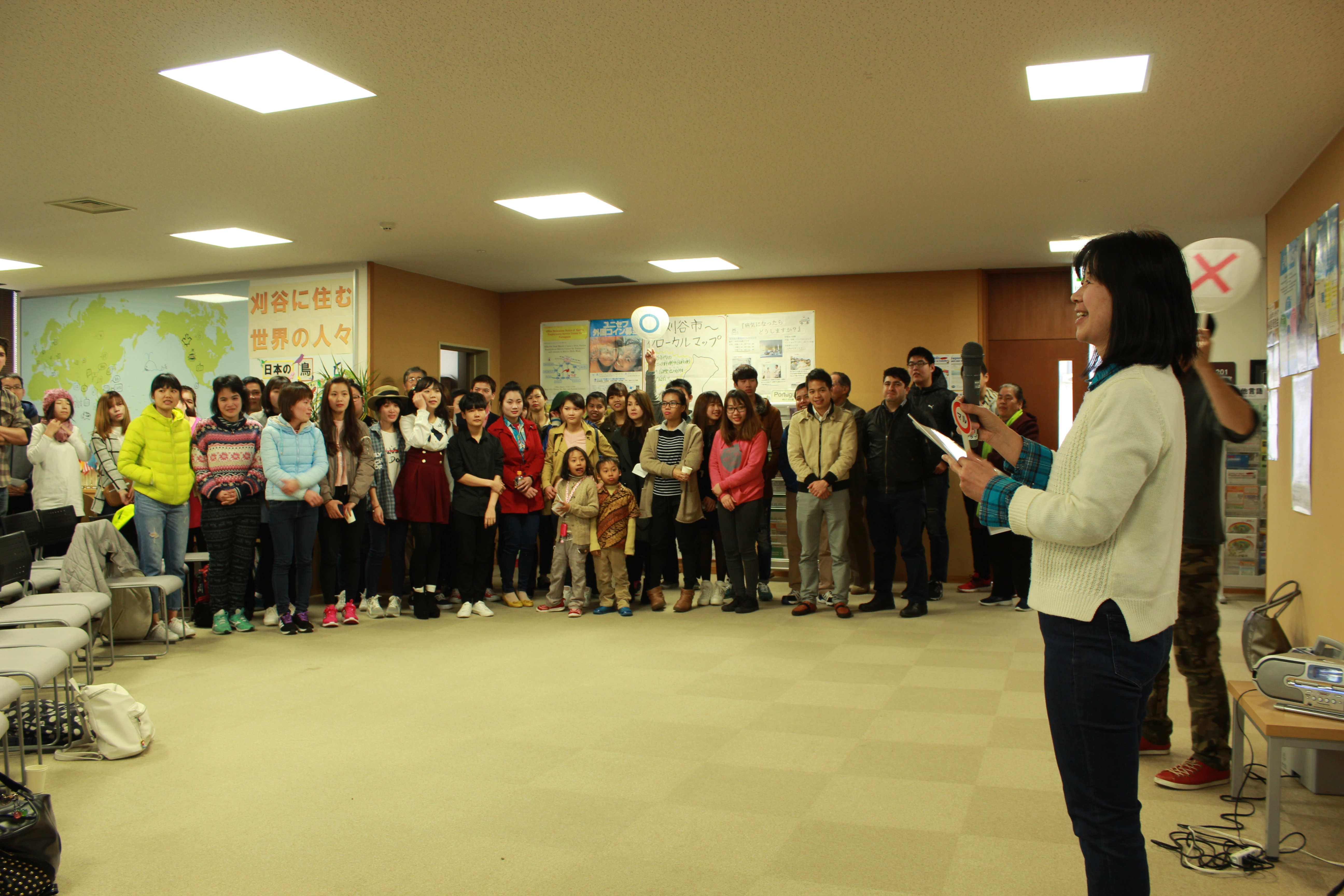 次に、全員参加でクイズを行いました。教室や刈谷市についてのクイズを○×式で答えます。最初は簡単な問題から、そしてだんだん難しくなっていき、最後は2人が勝ち抜き、賞品を受け取りました。よかったですね!